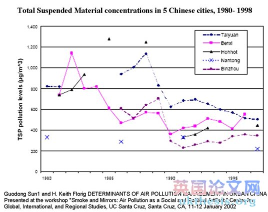 Total Suspended Material (TSP) is the mass of all particles in air. Samplers measure particles less than 25-50 micrometers in size. From Figure 1, it shows that the densities of TSP in China is higher than the cities in America or Europe. Since 1985, with some available approaches TSP densities are declining quickly in China. However, due to the status as a developing country and sufficient coal sources, it is difficult to address air pollution between 1980 and 1990 in some cities of China (Chan, C.K., Yao, X, 2008). What’s more, because of so large quantity of population in China, it will produce respectively 4.5 or 3 times the emission from the US or Europe (Barbara Demick, 2011).