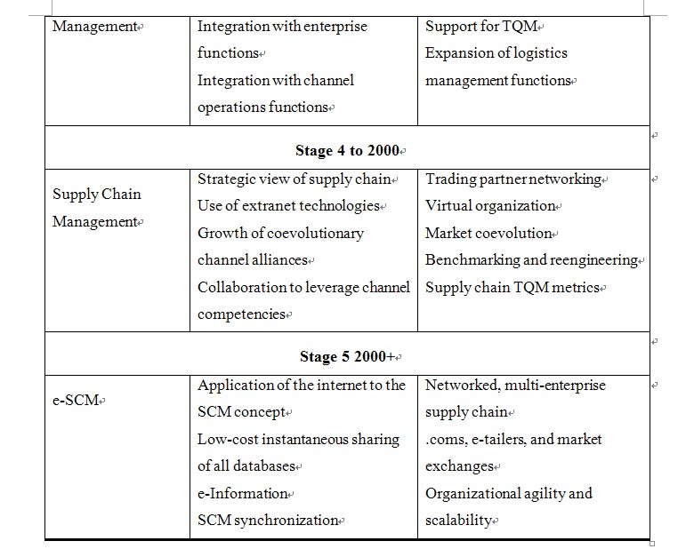 The SCM concept could be said to consist of five distinct management stages. The first can be described as the era of internal logistics departmentalism. In the second stage, logistics began the migration from organizational decentralization to centralization of core functions driven by new attitudes associated with cost optimization and customer service. Stage three witnessed the dramatic expansion of logistics beyond a narrow concern with internal warehousing and transportation to embrace new concepts calling for the linkage of internal operations with analogous functions performed by channel trading partners. As the concept of channel relationships grew, the old logistics concept gave way, in stage-four, to full supply chain management. Today, with the application of internet technology to the SCM concept, we can describe SCM as entering into stage five, e-SCM. These stages are portrayed in Table