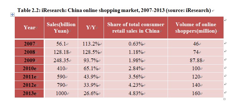 Table 2.2: iResearch: China online shopping market, 2007-2013 (source: iResearch)