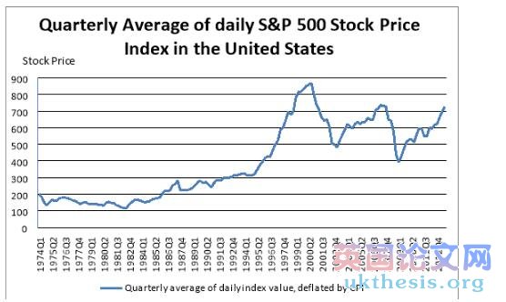 Figure 1.1 shows the moving trend of stock prices in the period from first quarter of 1974 to third quarter of 2013. From the figure, the stock prices in the United States generally showed a fluctuating rising trend with a record of expansion from 1974 to 2000 with gradual increasing rate at the beginning and higher pace increasing rate later from 1993 to 2000. There were significant market downturns in 2002 and 2008.#p#分頁(yè)標(biāo)題#e#