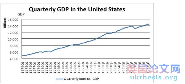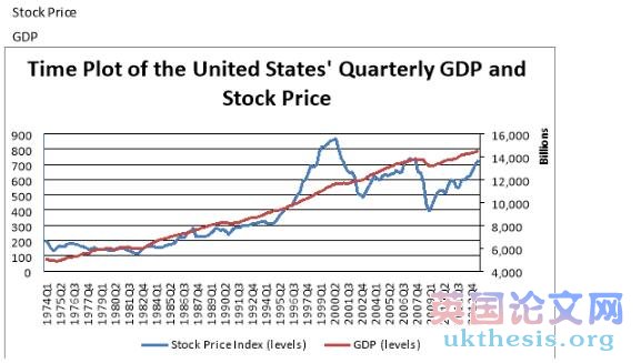 Figure 1.3 shows the relationship between stock prices and GDP in the time plot from first quarter of 1974 to third quarter of 2013. In the tradition connection of the stock price and GDP, stock price is believed to contain the predictive power towards the GDP. From Figure 1.3, the stock prices generally moving in the same direction with GDP. However, the market crash in 2000 brought about economic expansion instead of the economic recession. This phenomenon goes against with the tradition relationship between stock price and GDP. However, the market crash of 2008 has successfully predicted the economic recession in 2008.