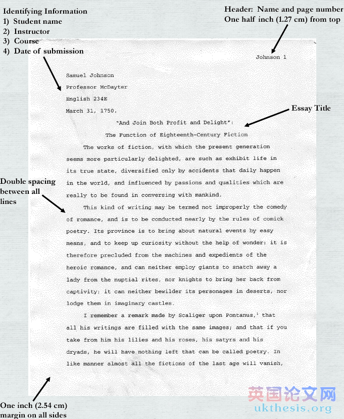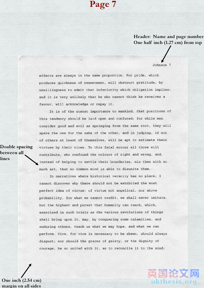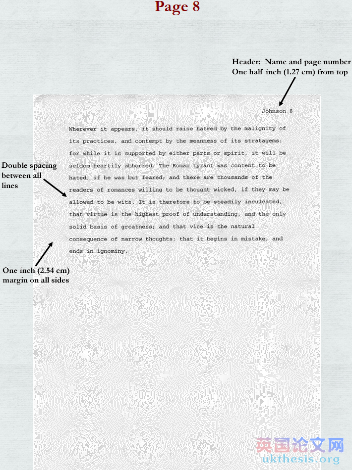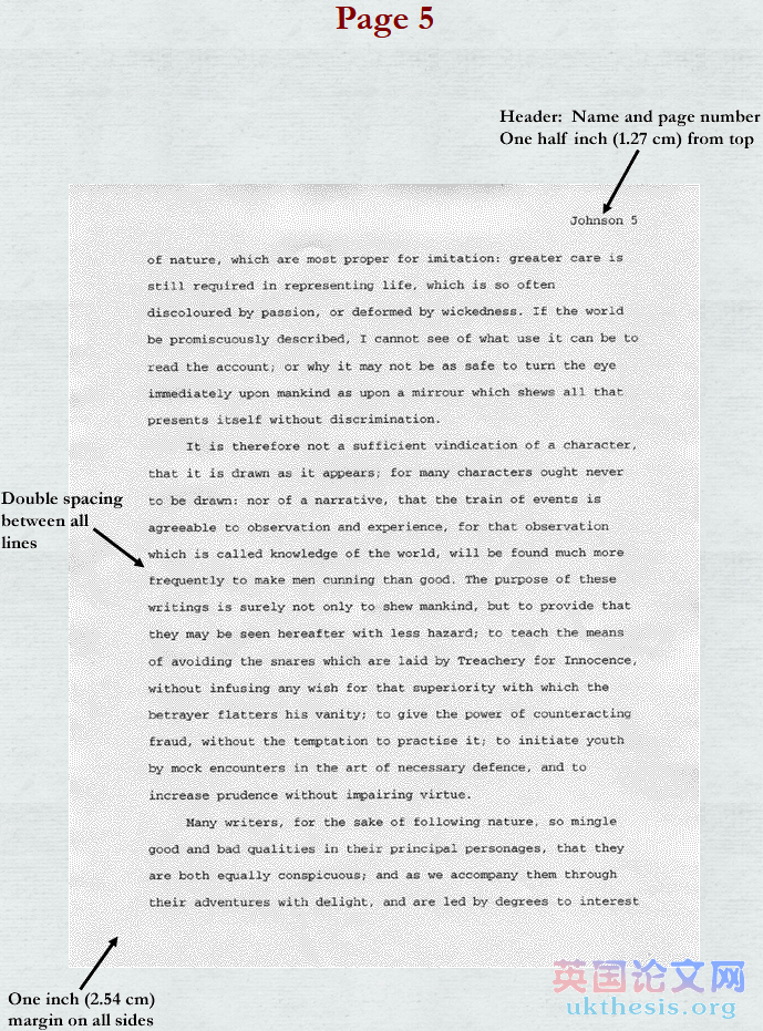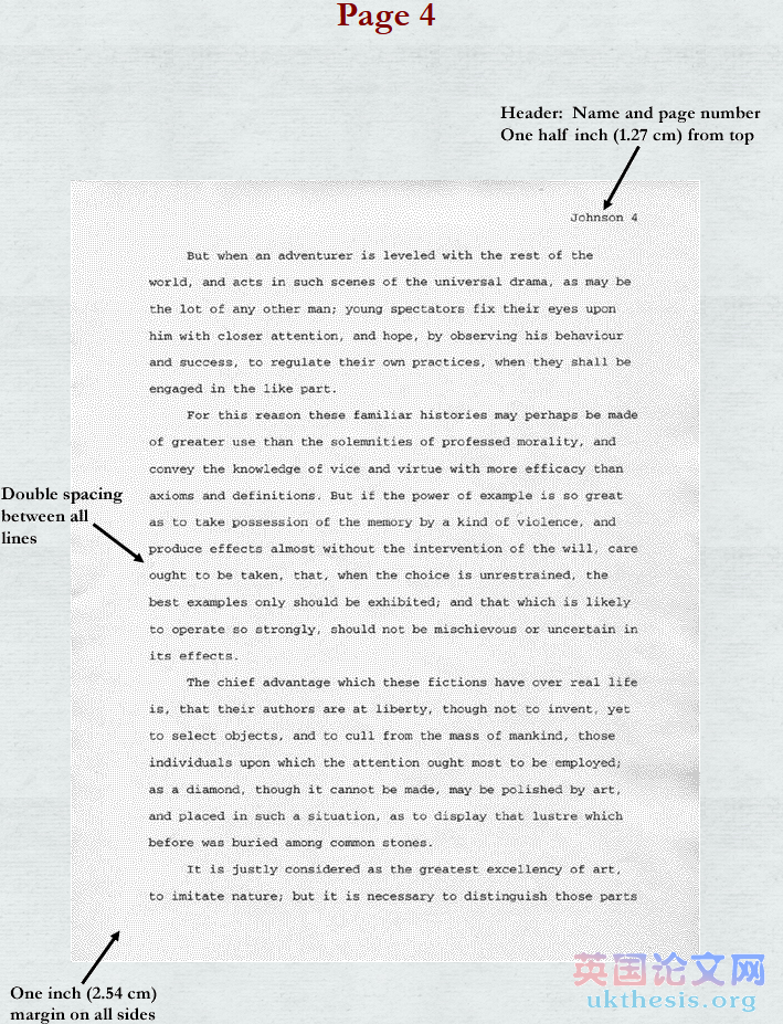 研究dissertation不應該是包括獨立的標題,而是需插入一個包括你的姓和頁數的“頭”,它與右對齊,離頁面頂部有1/2英寸(1.25cm)的距離。還有左對齊且每個行之間是雙倍行距,離頂部大約1.25cm(即距離為1英寸(2.54cm))的前提項目,如以下類型: