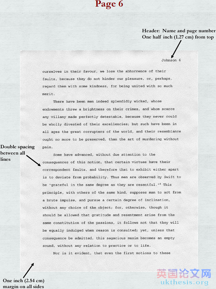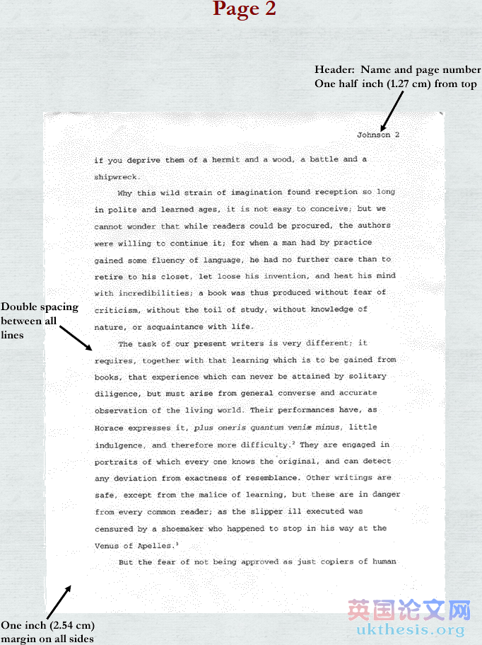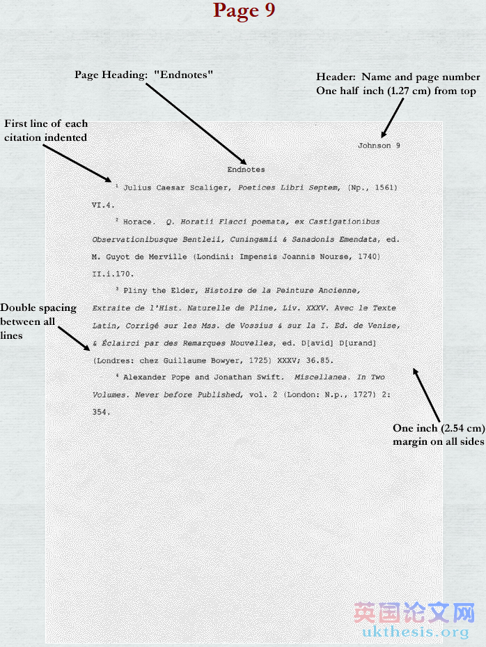 在每頁的尾注中同樣有包括你的姓和頁數的“頭”、它也是離頁面頂部有1/2英寸(1.25cm)處,在同一系列的其他dissertation中也要與連續編號。同樣是距離頁面頂部1英寸(2.54cm)處開始寫第一個尾注。