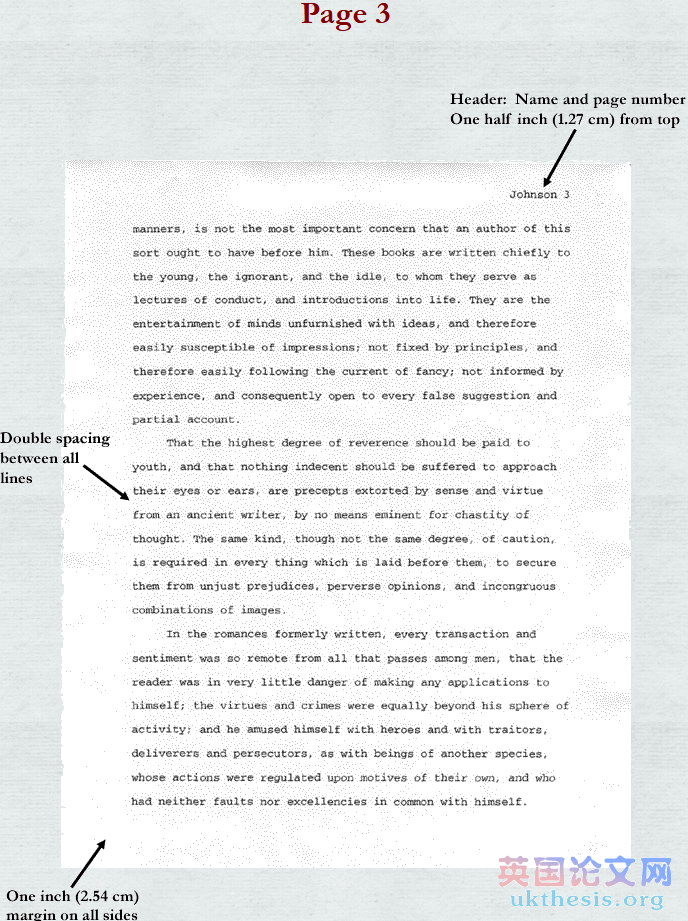 在接下來的頁面中有連續編號,都要有包括你的姓和頁數的“頭”,寫在也是離頁面頂部有1/2英寸(1.25cm)處,開始寫文章是以距離頁面頂部1英寸(2.54cm)處。