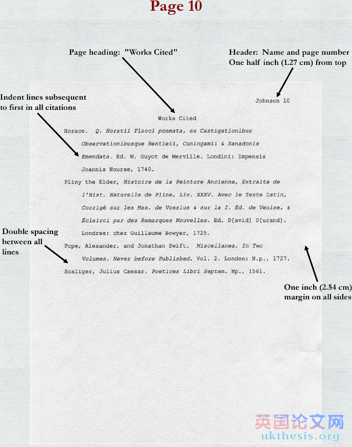 在參考過的作品清單中也要有包括你的姓和頁數的“頭”,寫在也是離頁面頂部有1/2英寸(1.25cm)處,且這些連續編號同樣會出現在同一系列的其他dissertation中。也是距離頁面頂部1英寸(2.54cm)處寫第一個書名目錄