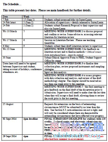 It is expected that you will dedicate regular time to your dissertation throughout the whole of the module, both during and after the scheduled support sessions, and throughout Semester 2 as well as during the summer period. You will need to bear in mind other module commitments (such as exam revision and/ or coursework in Semester 2), but you are expected to complete your literature review during Semester 2. Try to spend at least some time each week on your dissertation, even if this is only collecting literature. Week 15 of Semester 1 (Reading Week) should be used to finalise your topic and to start your proposal. Sessions will be run to guide you in the preparation of your Proposal during this week.#p#分頁標題#e#