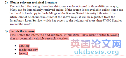 下面這個示例中,該作者的研究計劃分為了四部分:查找相關文獻,獲得文獻的方式,網上搜索相關內容,向專家或其他人員咨詢。