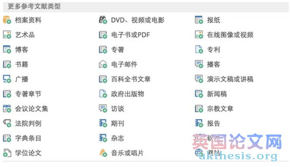 在這個網站,你可以通過選擇文獻類型,來生成bibliography。最常見的包括書籍、期刊dissertation、報紙和網站。