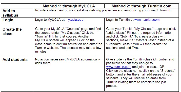 The chart on the next page outlines the basic steps for using Turnitin. The two methods are explained side-by-side so that you can compare them. For a more detailed introduction to the process, please set up an appointment with an ITC.