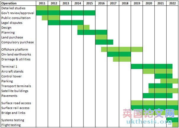 估計建設的時間表已根據審查其他主要機場建設項目,最特別的是關西,仁川,赤鱲角機場和最近的希思羅機場5號航站樓建設。