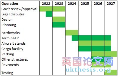 雖然第2階段將在2011年提交的原計劃的一部分,它是不是安全的假設,在11subsequent幾年有可能是沒有改變政府的政策逆轉,因此工作2年重新評估和應用批準預計第2期工程就可以開始之前。在此之后,在2024年進一步土壤經營和地面準備開始,隨后由2號航站樓。在2025年剩余的升級結構和一個國家的最先進的貨運設施的工作才能開始。
