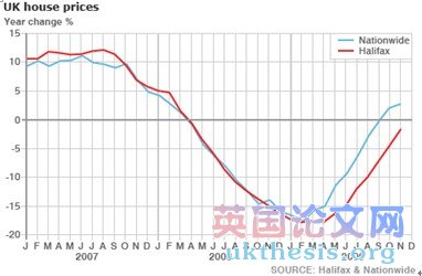 UK property market analysts have revised previously negative assessments of the market, with most subsequently predicting continued modest growth in prices in the mid-term24. However, around September 2007, house prices began to fall consistently, arguably contributing to the negative UK economic growth of the 3rd Quarter 2008.