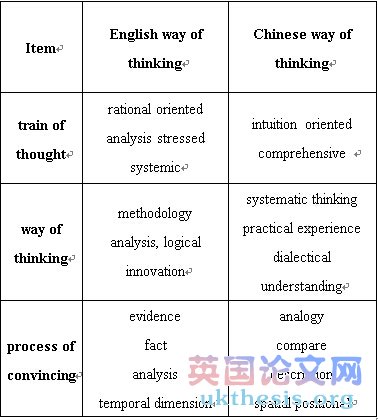 For the way of thinking, the largest characteristic of Chinese mode of thinking is comprehensive and the significant feature of English way of thinking is analysis (Xu et al, 2009). In the words of philosophy, Chinese way of thinking is rolling into one and English way of thinking is one dividing into two. Dialectical thinking in Chinese and English culture also is different. Chinese dialectical thinking pays high attention to unity of opposites to reach harmony and English dialectical thinking emphasizes conflict and stresses the opposition (Li et al, 2008). The thought of English often is outgoing and opposite and the thought of Chinese often is introverted (Xu et al, 2009). To analyze an issue, Chinese often is from far to near and English is just the opposite. Chinese concentrates on the main points from macroscopic aspects to microscopic aspects to make deeply analysis and English often starts from small point to expand the analysis. Chinese way of though often has composition of intuitive that master the essential characteristic of thing directly and English way of though often has strong rational element that without real evidence and a whole set of reasoning process, it is hard for English to accept some conclusion (Li et al, 2008). The difference of Chinese and English way of thinking shows in the following chart:#p#分頁(yè)標(biāo)題#e#
