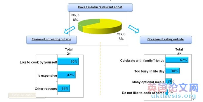 Celebrating is the most prevailing dining occasion (62%) vs. other occasions (“too busy in a day” 38%, and “many optional meals” 17%, etc). This indicates that consumers expect from the meal is more than “just for filling”. If the occasion is for celebrating, there will be higher expectation on service.慶祝是最盛行的餐飲場合(62%)與其他場合( “太忙一天” 38 %, “許多可選餐”的17 % ,等等) 。這表明消費者的期望就是一頓超過“只是為了填充” 。如果是為慶祝之際,會有更高的期望服務。#p#分頁標題#e#