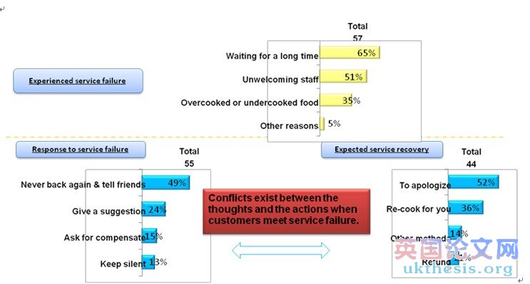 However, waiting for a long time which is a service before meal surprisingly stands out as the No.1 complain (65%). Unwelcoming staff is the 2nd complained failure (51%). All these are higher than “overcooked or undercooked food” (35%).