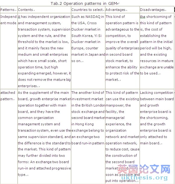 The other kind of pattern is the attached pattern. As the supplement of the main board, growth enterprise market operation together with main board, and they have the common organization management system and transaction system, even use the same supervision standard, and the difference is the standard to the market. This kind of pattern may future divided into two forms: An exchange two board run-in and attached progressive type. The another kind of investment market in the British London stock exchange and second board market in Hong Kong exchange belong to an exchange two board run-in pattern. This kind of pattern can use the existing manpower, the facility, the managerial experience, the organization network and market operation network, to reduce cost, cause the construction of the second board market standard as soon as possible and put into operation. Lacking competition between main board and growth enterprise board is the shortcoming, and the growth enterprise board is only attached to main board [3].