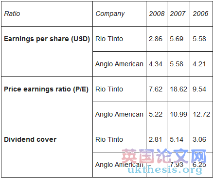 As stated by Walton and Aerts (2009) earnings per share are a way of checking whether profitability is growing from a shareholder-only perspective. EPS of Rio Tinto grew steadily over 2006 and 2007 however in 2008 it dropped to approximately half of its 2007 level (see Table 8). This was caused mainly by the lower net earnings in 2008 and therefore Rio Tinto's earnings per share were US$ 1.48 lower than EPS of Anglo American.