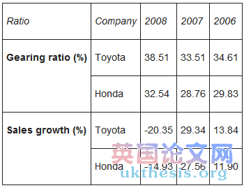 Sales growth is the increase in sales over a specific period of time, often but not necessarily annually (Investor Words, 2009). It was observed that Toyota and Honda sales growth decreased drastically in 2008 as vehicle sales worldwide were strongly damaged by a substantial contraction in the automotive market caused by the rapid deterioration of world economic growth.