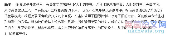 Nowadays, with the opening-up of China, English teaching has been getting more and more attention, especially since Beijing won the bid to hold the 2008 Olympic Games. People are enthusiastic about learning English. Most of our students begin to learn English from Grade 3 in primary schools. However, classroom teaching has long been the only way to learn English in China, and the method has usually involved cramming grammar-translation knowledge into learning a language. But this approach of teaching and learning English is evidentially passive, because it goes against the principle of English teaching, which requires that listening and speaking take the lead in English teaching, and on the basis of these two skills, reading and writing will be cultivated. So speaking as one of the four language skills has played a very important role in English teaching in middle schools. What?s more, with the reformation of new process of teaching, it requires that the students will have the expressing ability to receive and pass information in English in real occasions. But many students often can speak well in class or in relaxed occasions, and when they are put in a real condition, they can?t. Why does it appear? Well, it is affected by many elements One of the elements is their English speaking ability.. So it demands the English teachers in junior schools to develop the student's speaking ability. So also it is necessary for the teachers to help the students develop the ability of speaking.