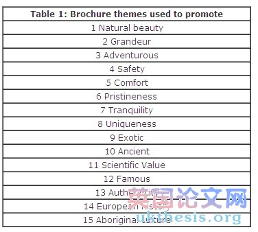 Most tourists depend heavily on promotional literature in lieu of direct experience of place (Echtner & Ritchie 1991). The tour brochure, as one of the most traditional and most effective promotional literature, always plays a leading role in the tourism. A semiotic analysis of these tour brochures uncovered 15 themes commonly used to promote the area (Young 1997) as the table 1 below showed.
