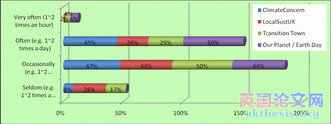 The necessity of access is also probed through the Q4 of the questionnaire. In Q4 (See Appendix R3), no specific enthusiasm of accessing these fora has been reported, and most responses tend to describe their necessity of access among “occasionally (every 2 or 3 times I access Internet)” (40.63 %) and “if they have some time to surf Internet for leisure purposes” (24.22%). The reported low necessity of access indicates that people tend to separate their needs of accessing Internet and accessing their fora, and having discussions in these fora are not their main reason to surf Internet. However, the tendency has a slightly difference among these four fora: most responders from ClimateConcern (8%), Transition Town (8%), and Our Planet / Earth Day Groups (6%) say they access this forum occasionally (every 2 or 3 times when they access Internet), while significant proportion (26%) of LocalSustUK’s members claim that they “quite often access this forum while I log onto Internet”. The difference implied that the LocalSustUK Group has more active members who have higher necessity of access their forum.