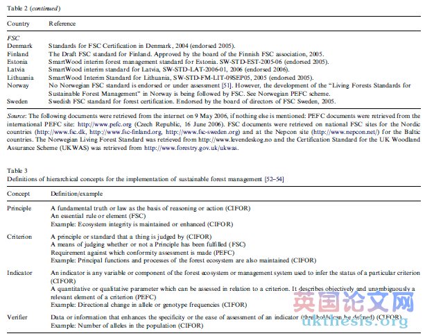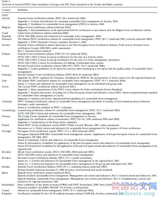 Table 2 Overview of national PEFC forest standards in Europe, and FSC forest standards in the Nordic and Baltic countries Country Reference PEFC Austria Austrian forest certification scheme, PEFC 06-1-1(endorsed 2006): Appendix 1. Criteria and indicators for assessing sustainable forest management in Austria, 2004. Appendix 2. Guidelines for sustainable forest management (PEFC) in Austria, 2004. Belgium Belgian Forest certification scheme (endorsed 2002): Appendix 3. Recommendations at the operational level for certification in accordance with the Belgian forest certification scheme. Czech Czech forest certification scheme (endorsed 2006): Republic CFCS 1002:2006 criteria and indicators for sustainable forest management, 2006. Denmark The Danish PEFC certification scheme for sustainable forest management, PEFC 09-1-1 (endorsed 2002, revisions endorsed 2004): Appendix 2. PEFC Denmark’s forestry standard. Revision 1, 2002. Estonia Estonian Forest certification scheme (pursuant to the Pan-European Forest Certification Scheme, Final version, Estonian forest certification Council, 2002/2003, under assessment): Part 2. National forest standard. Finland Finnish Forest certification scheme, PEFC 02-1-01 (endorsed 2005): FFCS 1002-1:2003, Criteria for group certification for the area of a forestry centre. FFCS 1002-2:2003, Criteria for group certification for the area of a forest management association. FFCS 1002-3:2003, Criteria for certification of holdings of individual forest owners. France Revised French forest certification scheme 2006–2011, PEFC 10-1-1 (endorsed 2006): Appendix 5. Lisbon guidelines (to be taken into account when drawing up a site report and the quality policy of sustainable forest management). Germany Revised German Forest Certification Scheme, PEFC 04-01-01 (endorsed 2005): Appendix III. PEFC standards for Germany. Guidelines for SFM for the incorporation of forest owners into the regional framework. Italy The Italian PEFC certification scheme for sustainable forest management, PEFC 18-1-1 (endorsed 2004): Annex 2. Criteria and indicators for sustainable forest management on an individual and group scale. Latvia The Latvian PEFC certification scheme (endorsed 2001): Appendix 2. Basic requirements of the PEFC Latvia scheme for forest certification (Forest Standard). Appendix 3. Analysis and review of existing sets of Pan-European criteria and indicators versus PEFC scheme and performance standard for sustainable forest management in Latvia. Appendix 4. Analysis and review. Operational-level guidelines for sustainable forest management. Lithuania PEFC Lithuania certification scheme of sustainable forest management and chain of custody of forest-based products (technical document, under assessment): Annex 4. Certification standard of PEFC, Lithuania. Luxembourg Luxembourg certification scheme for sustainable forest management, PEFC 22-1-1 (endorsed 2005): LFCS 1002:2005 Criteria and indicators for sustainable forest management, 2005. Norway The Living Forests standards for sustainable forest management in Norway. Application for certification scheme re-assessment, PEFC 03-1-01, 2005 (endorsed 2006 until 2008): Appendix 2. Interpretation of the living forests standards. Poland Polish PEFC Forest certification system (PEFC Polska Council, Warsaw, 2005, under assessment): Document no. 4. Polish criteria and indicators for sustainable forest management for the purpose of forest certification. Portugal Portuguese forest certification system, PEFC 13-1-1, 2003 (endorsed 2004): Portuguese Standard 4606:2003. Sustainable forest management systems. Application of the pan-European criteria for sustainable forest management, NP 4406, 2003. Annex A (technical). Criteria and indicators of sustainable forest management. Annex B (informative). Guidelines for application of the pan-European criteria and indicators of sustainable forest management. Annex D (informative). Guidelines for the application of the pan-European criteria and indicators of sustainable forest management at the regional level. Slovakia Slovak forest certification system, SFCS, 1001:2004, 2004 (endorsed 2005): SFCS 1002:2004 criteria and indicators of sustainable forest management. Slovenia Slovenian Forest Certification Scheme, PEFC 27-1-1 (under assessment). Annex no. 2. Criteria and indicators for Sustainable forest management at the regional level, 2005. Annex no. 3. Criteria and indicators for Sustainable forest management at the group and individual level, 2005. Sweden Swedish Forest Certification Scheme, PEFC/05-1-1, including annexes (endorsed 2006): Revised Swedish technical document II, 2006 (Forestry, environmental and social standard). Spain Spanish forest certification scheme (endorsed 2002): Spanish standard. Sustainable forest management. Management unit criteria and indicators. Part 1: General criteria and indicators, 2001. Spanish Standard. Sustainable forest management. Management unit criteria and indicators. Part 2: Complementary criteria and indicators for regional assessment, 2001. Switzerland Swiss conference of the timber economy (HWK) and PEFC Switzerland, 2000, Swiss Q-label certification scheme (endorsed 2006): National standard ‘‘Q-LABEL WOOD’’ for Forestry in Switzerland. United Scheme for sustainable forest management, PEFC 16-1-1 (endorsed 2002): Kingdom Certification standard for the UK Woodland assurance scheme (UKWAS). Forestry commission, 2000. #p#分頁標(biāo)題#e#