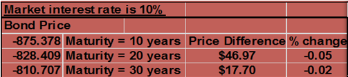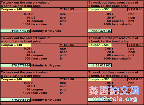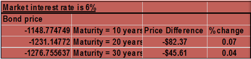 We can demonstrate this with an example: Bond details: Maturity 10 years, coupon rate 8%, coupon payment $40 paid semi-annually, bond face value $1000. The annual market interest rate is 6%.