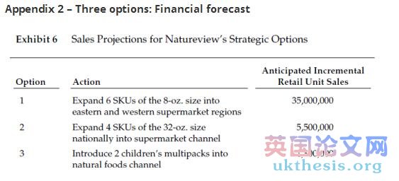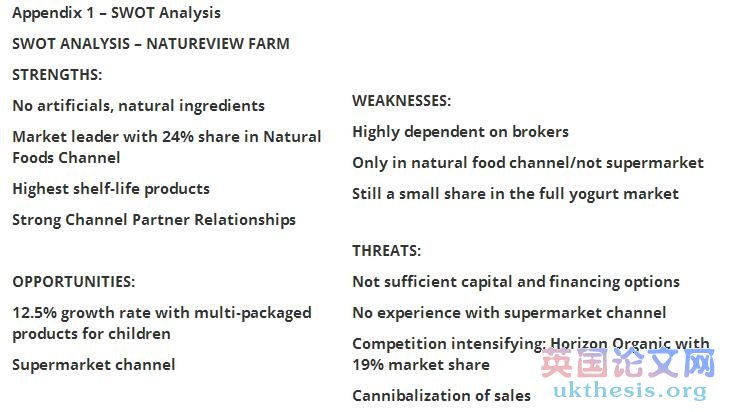 Natureview Farm 是一個生產有機酸奶并且以24%市場份額的行業龍頭公司。其制造工藝包括特殊配方,保質期較長,無任何人工成分,產品品種差異化的品牌定位鮮明。酸奶在佛蒙特州生產,只在天然食品商店出售.。目前的困境是他們創造的戰略計劃,主要基于面向分布選項,超過2000萬美元的收入在2001財年結束的標志。這得益于風險資本家公司的撤出.。分銷策略圍繞著留在天然食品商店或進一步擴大到超市渠道。因此,問題的定義是,有必要擴大和增加客戶群,以推動銷售,這將導致收入增加,以滿足企業目標。附錄1中有一個SWOT分析,將有助于指導后續的討論。