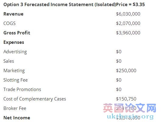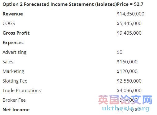 Finally, Option 3 gives a better profit than the former but not sufficient revenue. Nevertheless, this option highlights the trend and the researched growth rate of 12.5% with the children’s market and multi-pack sales which is an opportunity to capitalize on. This option also bears the least amount of risk due to minimal investment, maintaining and enhancing relationships with existing intermediaries and channel partners, and not having to undergo marketing changes such as brand positioning, or significant production changes. Gross profits with product sales here are 37.6%.