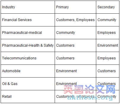 Coopers et al (2001) also contended that the organisations who transact directly with consumers individually are more enthused to centre all their efforts on that very stakeholder. Swenney and Coughlan (2008) research as seen on the table shows that the retail industry primarily circled their attention on customers and less on environment. The result was a little surprising as he expected them to focus on employees given their industry type and the large amount of employees that work in this industry