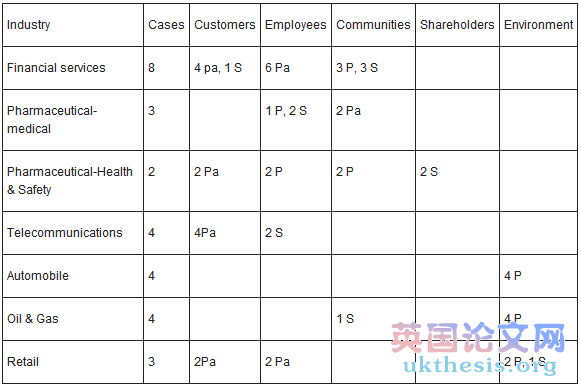 The literature review classified different stakeholders according to the Clarkson risk based model (1995) and also proposed that organizations should focus more on chief stakeholders than other stakeholder. Swenney and Coughlan (2008) research addressed this literature in their findings of six different industries through the use of annual report and CSR reports and their narrow view of stakeholders. Firms where picked from the FTSE4Good and United States and European indices as Maklon and French (2005) recommended. The 30 organizations numbered and where divided into six given industries for the sole purpose of finding out how organisations through content in annual report and CSR report classified and viewed stakeholders