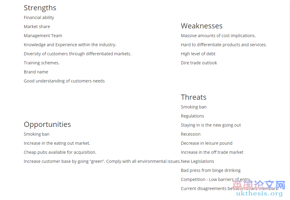 These strategies are aimed at minimising both the weaknesses and the threats. The way in which Mitchells and Butlers can do this is by differentiating its products and services from the threat it faces from the off trade.