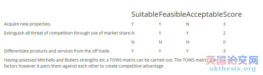 Having assessed Mitchells and Butlers strengths etc a TOWS matrix can be carried out. The TOWS matrix uses the same four factors however it pairs them against each other to create competitive advantage.